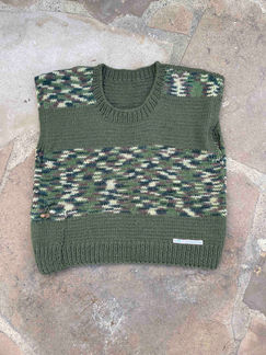Strikket kamouflagevest med sidelomme og bambusknap. Uld/bomuld restegarn fra Maribo. Vesten er mørk/ grågrøn med kamuflagemønster på mave og skuldre og tre broderede pynteblomster.